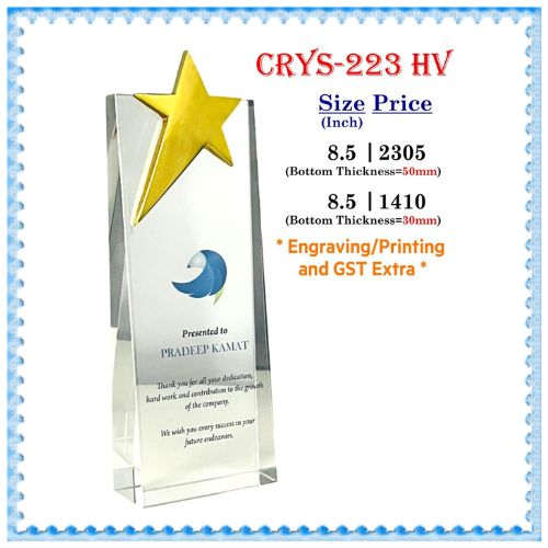 A crystal trophy that combines both beauty and clarity, designed to honor outstanding achievements with its simple, sleek lines. The clear surface reflects light beautifully, symbolizing the brilliance of the recipient’s efforts and success. Ideal for business, sports, or academic awards, this trophy is a lasting tribute to excellence.