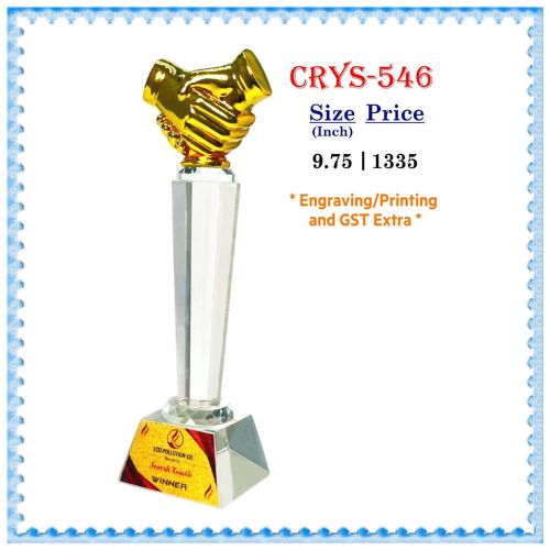 “This crystal trophy features a detailed handshake design, symbolizing collaboration, unity, and mutual achievement.”